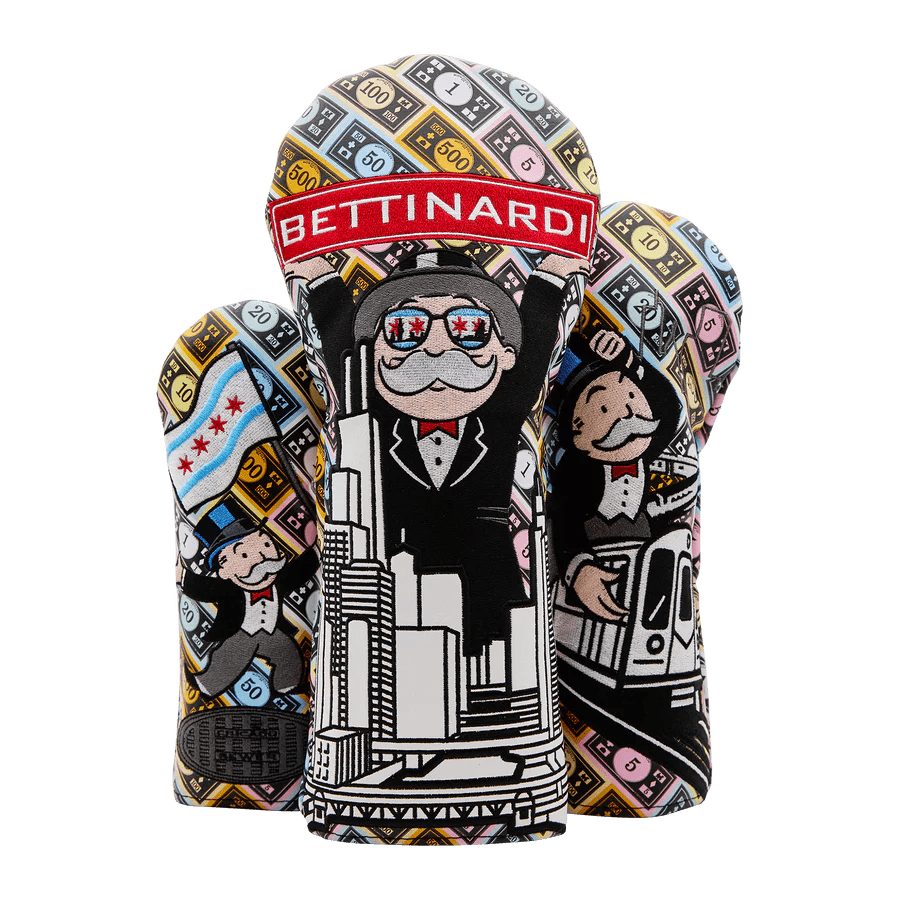 Mr. Monopoly is making big moves in the Windy City! This Chicago-themed wood set showcases Mr. M living it up across the town he now claims as his own. On the driver, Mr. Monopoly proudly hoists his Bettinardi sign high above the skyline. The 3-wood captures him taking a leisurely ride on the iconic L train, while the hybrid shows him waving the Chicago flag with flair. Each headcover is stitched on a Monopoly money base and finished with a plush black interior. Add a touch of Chi Town pride and Monopoly mischief to your bag with this wood set! Limited quantities are available.