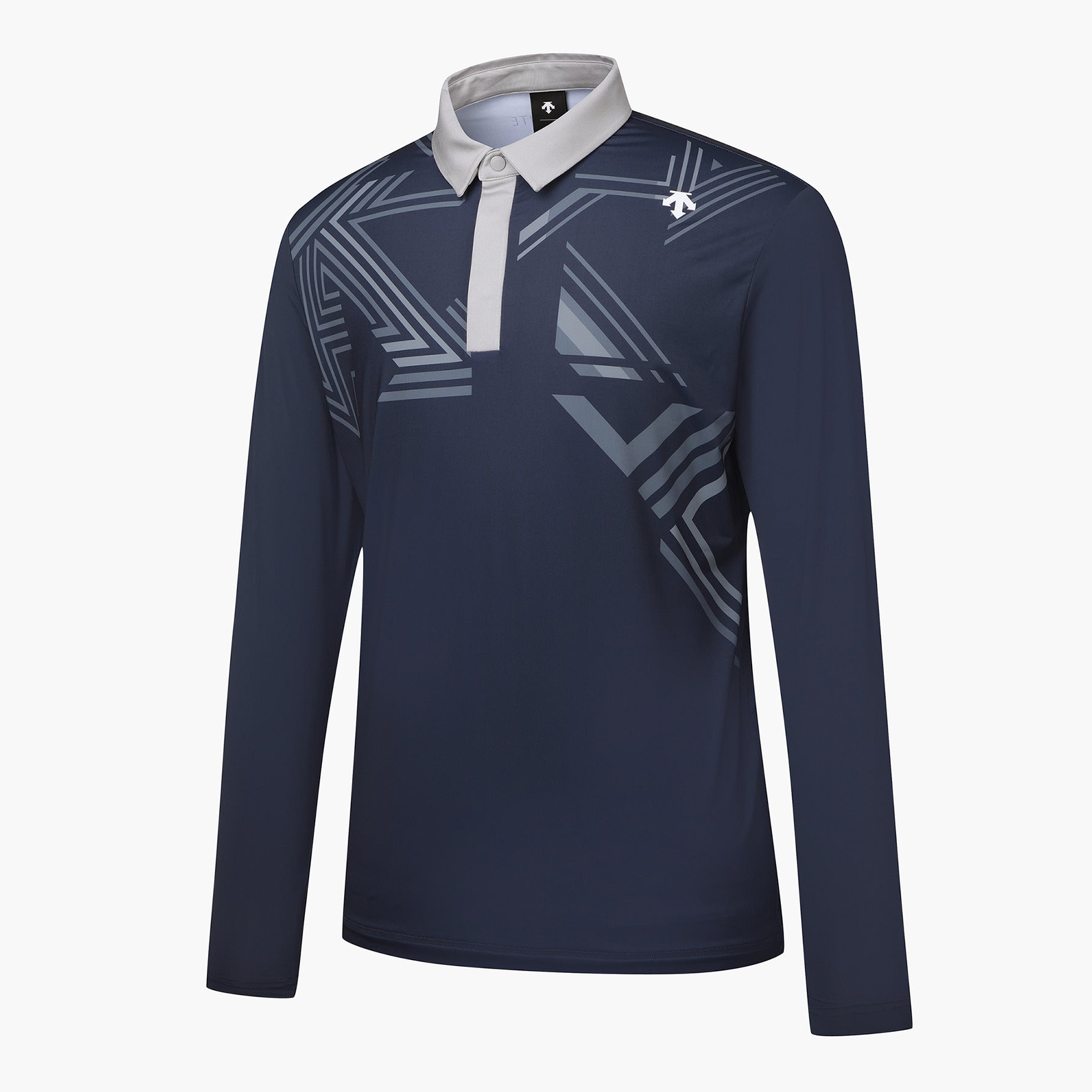 This is a cool long-sleeved collared T-shirt with a Descente logo graphic.