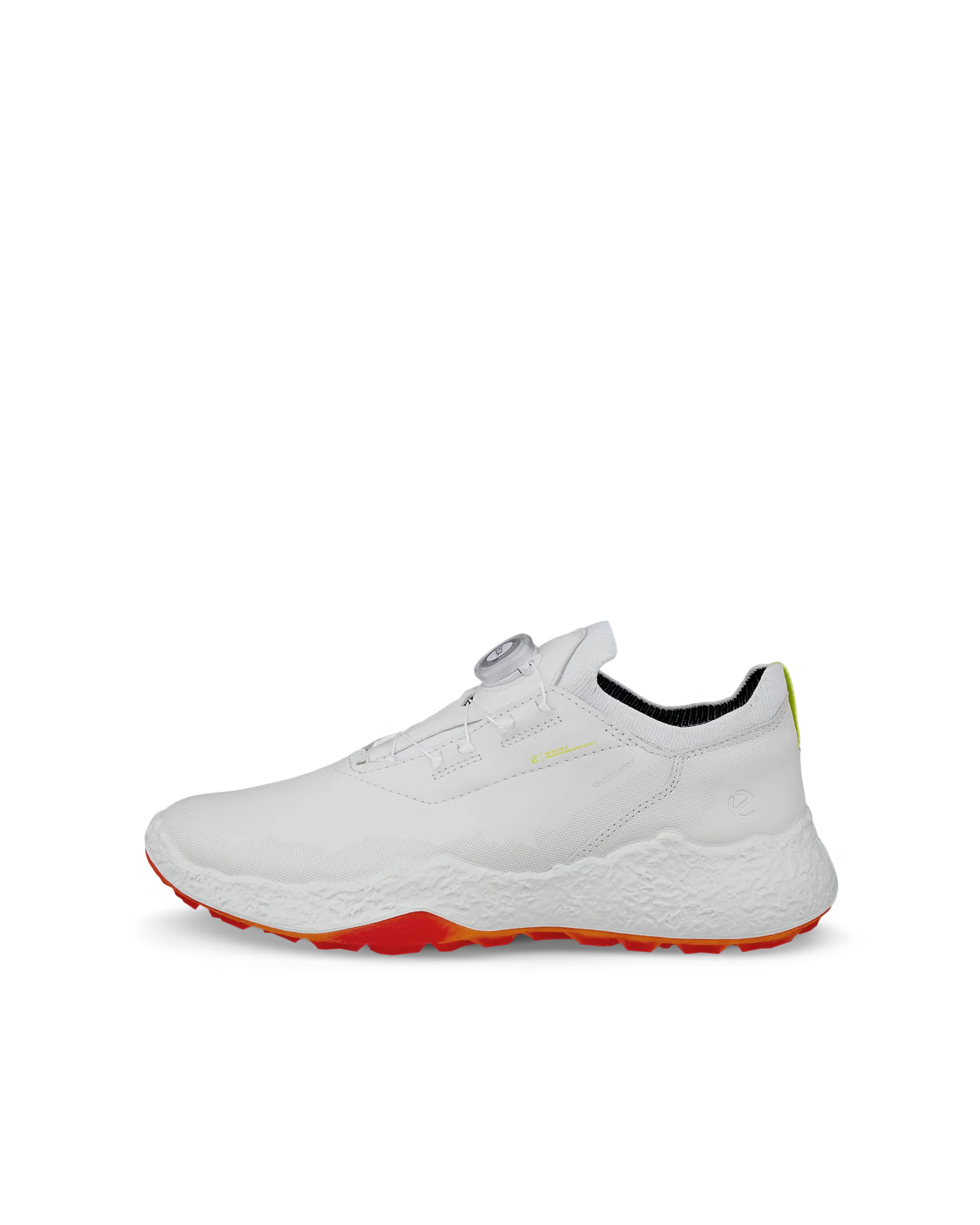 Inspired by the wild and rugged nature of the Scottish Highlands, and powered by exclusive Danish technologies, the ECCO W GOLF BIOM H5 BOA is a new performance golf shoe built for the elements. If many consider Scotland to be the home of golf, Denmark is driving innovations in the sport: state-of-the-art ECCO-TEX waterproof membrane will keep your foot dry and comfortable in wet conditions. For a modern, sporty aesthetic as well as all-day comfort, this next generation BIOM golf shoe is crafted from ECCO Performance Leather with a one-piece engineered knit sock, while the BOA® Fit System delivers micro-adjustable precision fit. Along with a snug fit, the BIOM® NATURAL MOTION® technology creates stability and forward momentum for power during your swing. Wherever your round, and your day, takes you, the new and innovative outsole delivers stability and traction.