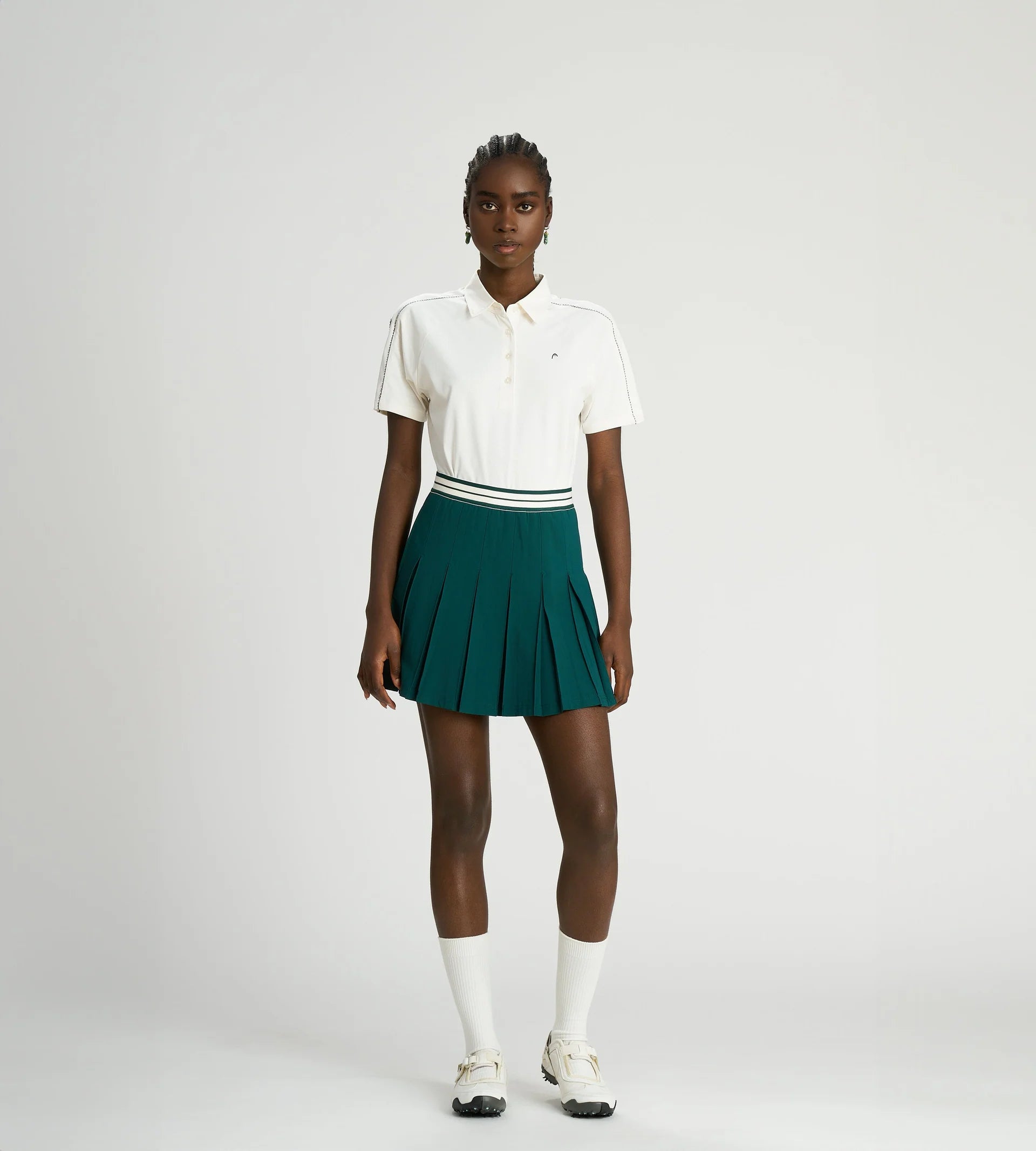 Our classic box pleated skirt combines style and functionality with bold box pleats and convenient side seam pockets for a sleek, clean look. The customized elastic waistband ensures a soft hand feel, blending comfort with elegance. Crafted from recycled polyester and spandex twill, it offers regular moisture-wicking for all-day comfort and ease of movement. Finished with matte silicone logos at the front and back, it??¢s perfect for active, stylish wear.