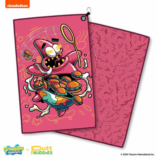 Get ready to elevate your golf bag with the Magnetic 'Krusty Patrick' Golf Towel from the exciting collaboration between SpongeBob SquarePants™ and PuttBuddies™! This towel features a vibrantly unique design that captures beloved character Patrick's iconic love for Krabby Patties.