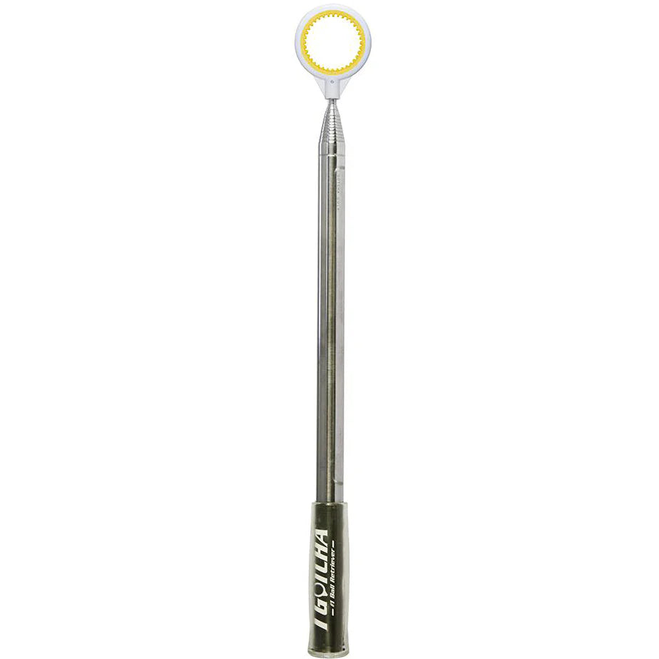 Designed with rubberized "teeth" that securely grip and hold a golf ball securely in place without moving parts for an effortless retrieval. Patented stainless steel shaft. Single-piece head design. Ultra-compact to fit in any standard golf bag.